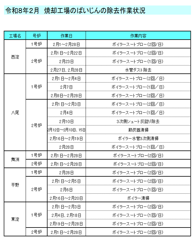 ばいじん除去作業状況 ※1 住之江工場のばいじん除去作業状況は、運営事業者ホームページに記載されています。 https://suminoe-ht.com/info/(外部リンク) ばいじん除去作業状況 令和7年度 令和6年度 令和5年度 令和4年度 焼却工場の運転状況については、各工場へお問い合わせください。お問合せ先